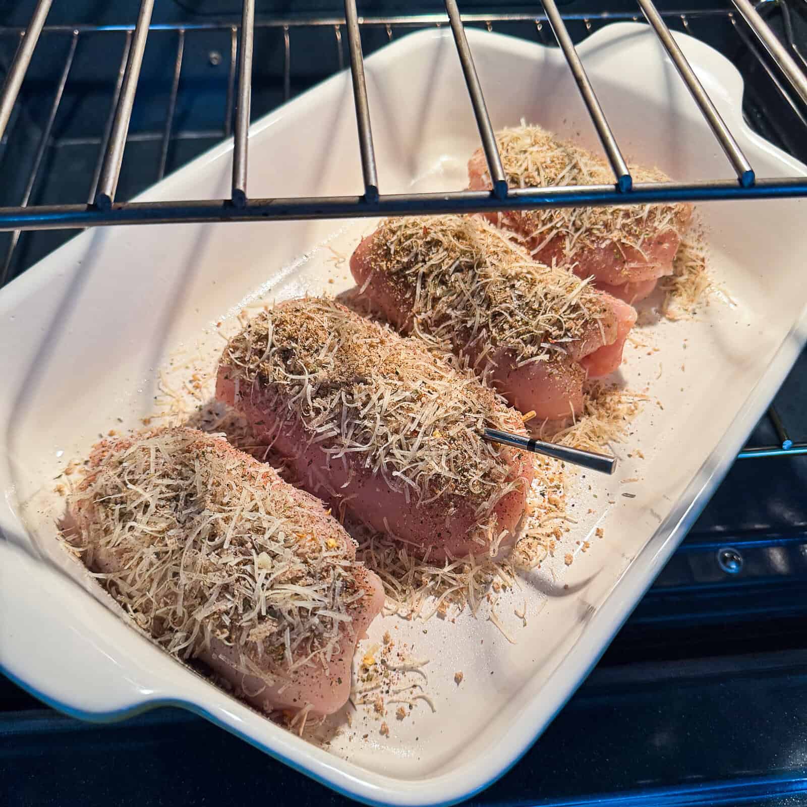 - Prepare for baking. Place the chicken rolls in a large oil-sprayed baking dish, leaving space between them. Lightly spritz with olive oil (~½ tsp per roll). Sprinkle 2–3 tbsp of crispy topping over each roll. Spritz with more olive oil on top. Optional: Insert a wireless thermometer to the largest piece of stuffed chicken monitor doneness.