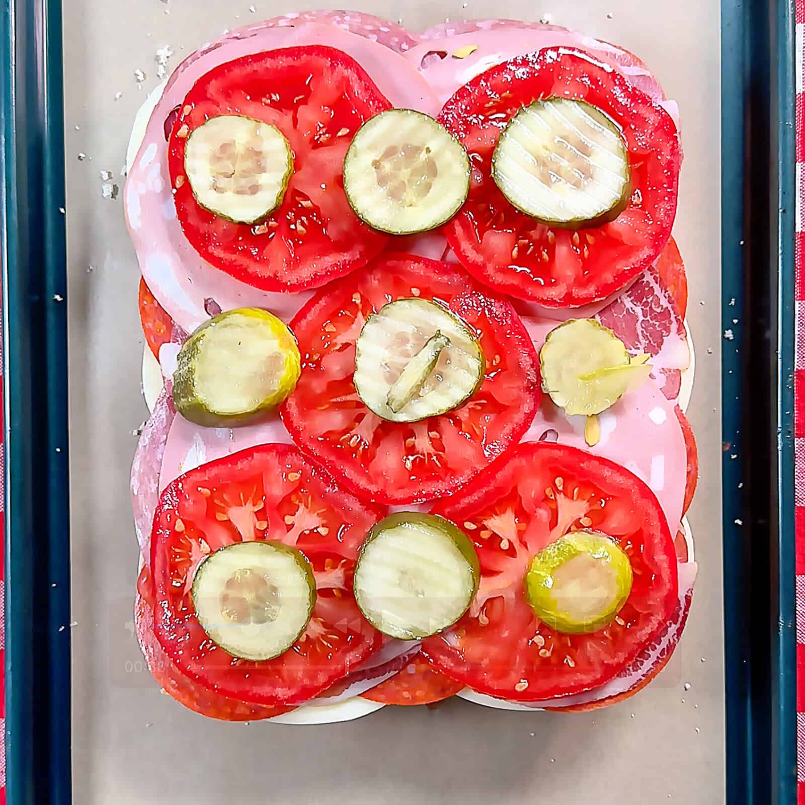 - Add toppings. Add sliced tomatoes and pickles (and/or add red onion or roasted red peppers).
