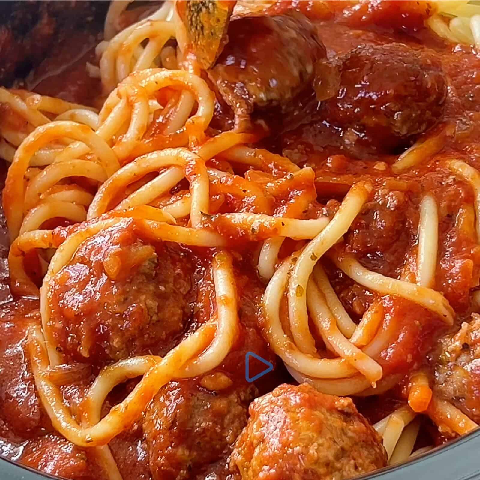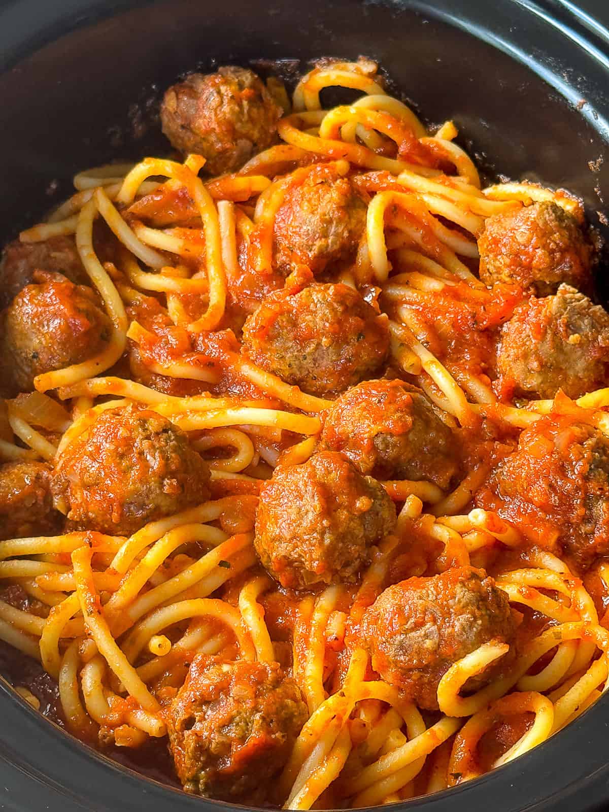 This easy slow cooker spaghetti and meatballs recipe is perfect for busy weeknights. Juicy beef meatballs simmer low and slow in a rich tomato sauce with flavorful sautéed onions and garlic, then are served over perfectly cooked spaghetti.