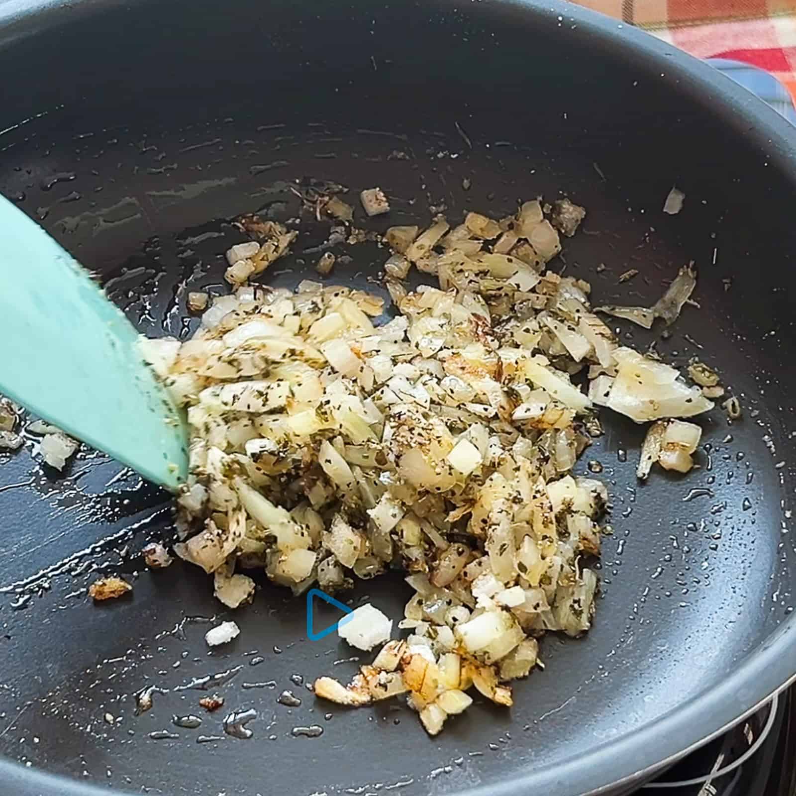 - In a skillet over medium-high heat, add onion, olive oil, salt, pepper, and Italian seasoning. Sauté and stir for 5 minutes, adjusting heat down to medium if needed so it doesn’t burn.