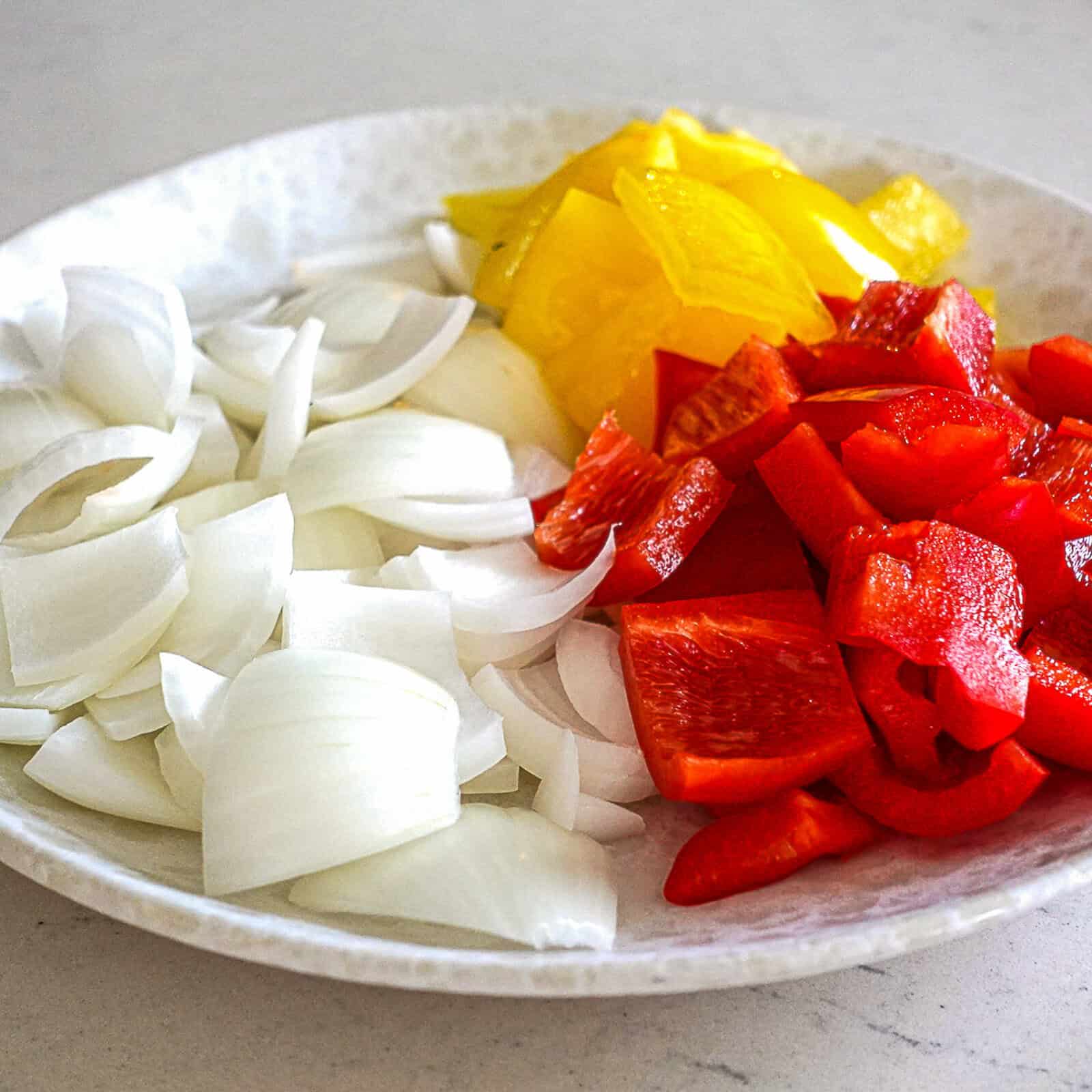 - Prepare vegetables. While the chicken marinates, chop onion and pepper into large chunks. Separate the layers of the onion.