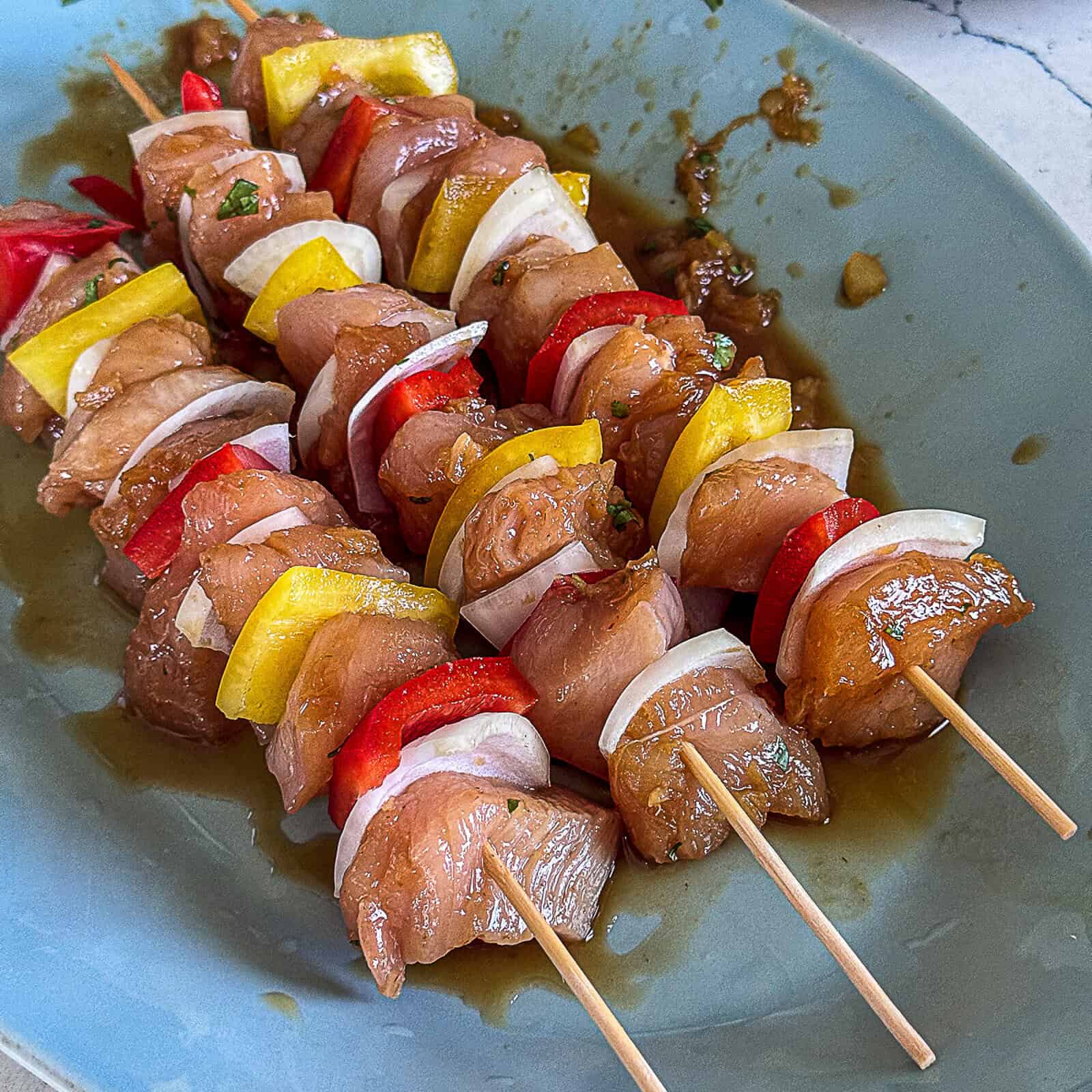 - Assemble skewers. Alternate pieces of marinated chicken, onion layers, and pepper chunks on the skewers. Pack them close, leaving about 2 inches free on each end for easy handling and eating.