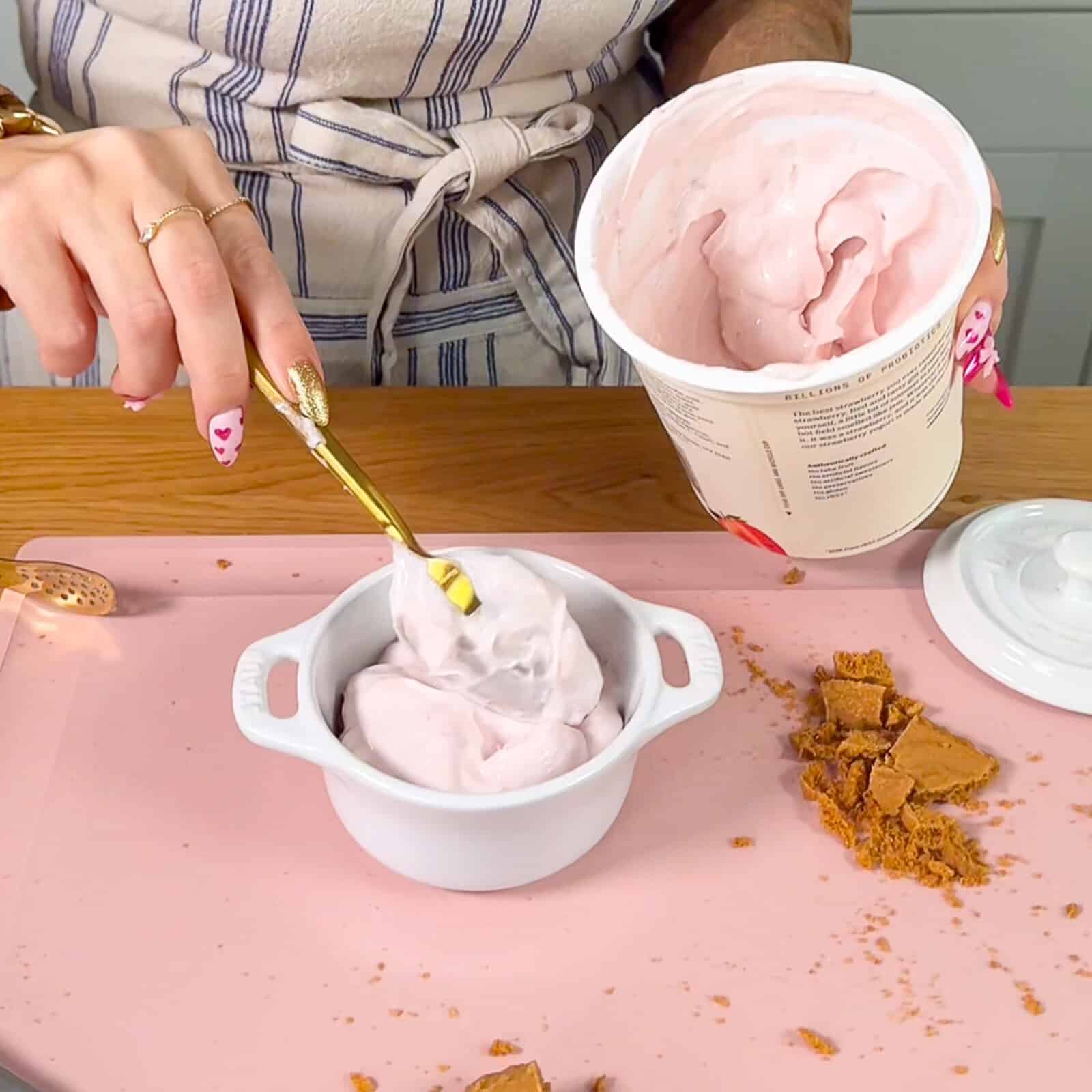 - Spoon the Greek yogurt on top of the cookie crumbs.