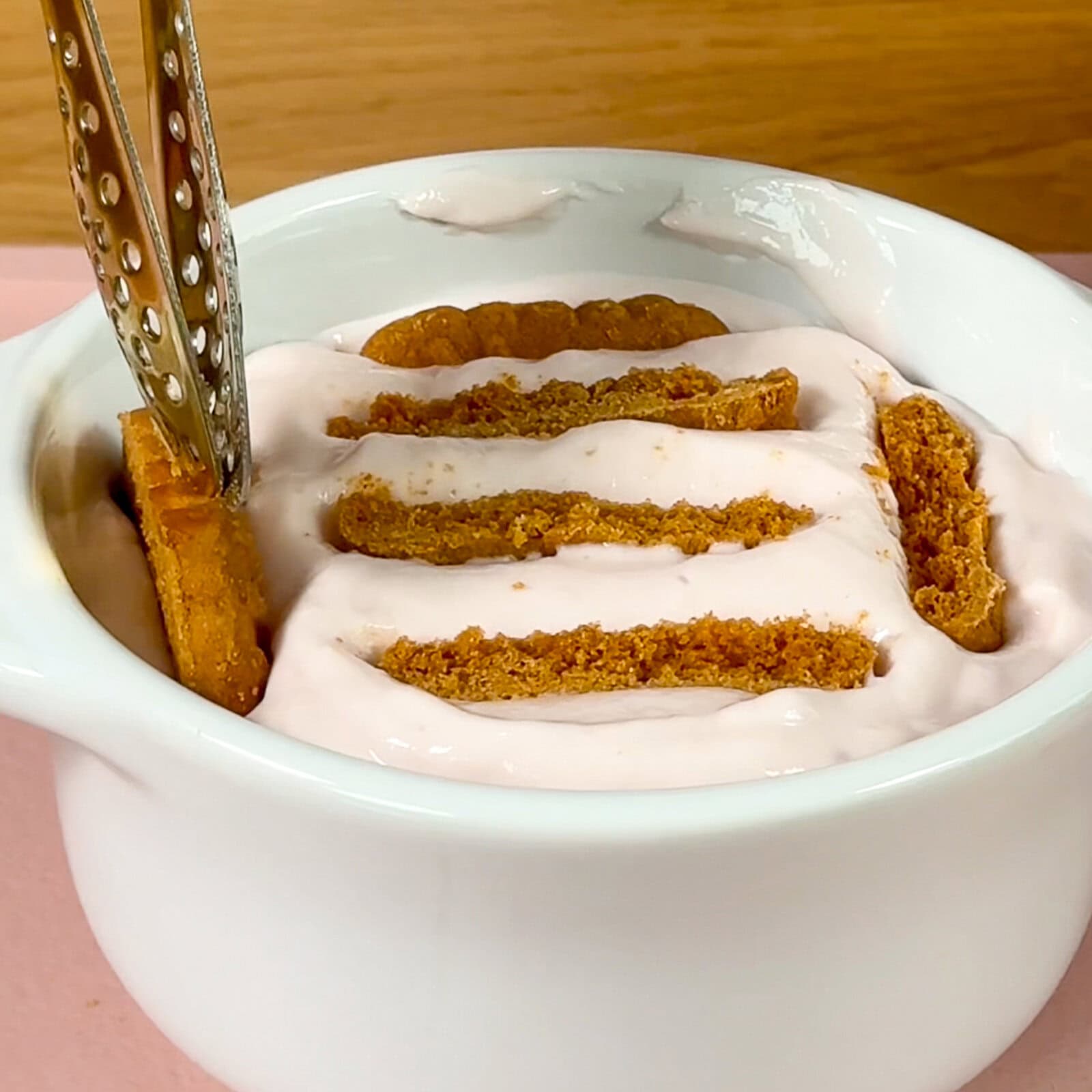 - Cut 1–2 Biscoff cookies down to the size of your yogurt container.
