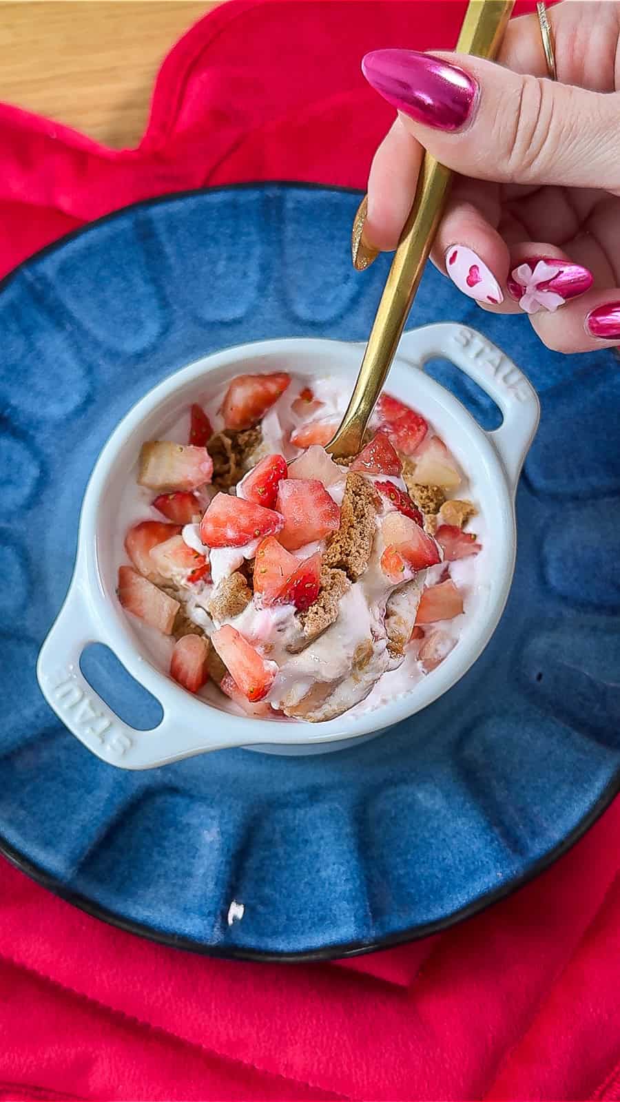 - Gently press the cookies into the yogurt, leaving about 1 inch of space between each piece so they soften evenly. Add diced strawberries on top.