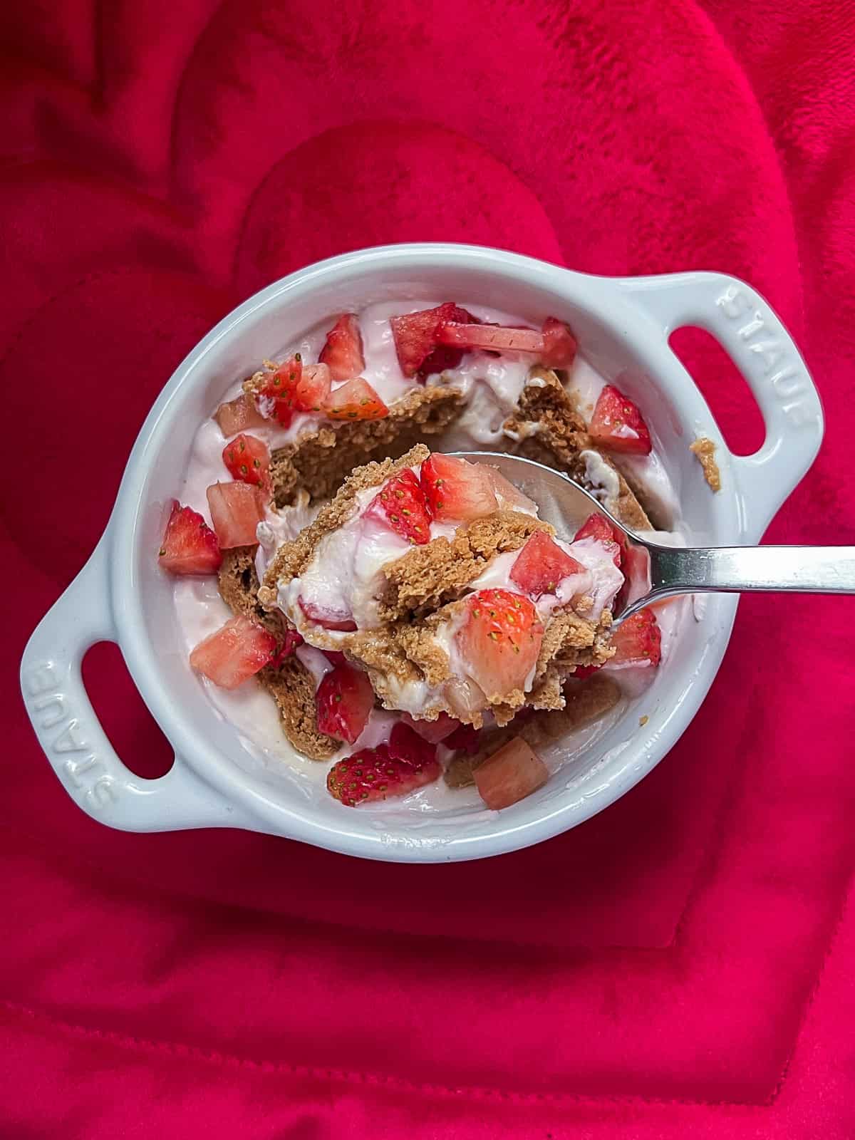 - Cut the remaining Biscoff cookies into pieces to fit the height of the dish, and gently press them into the yogurt, leaving about 1 inch between pieces. Top with diced strawberries.